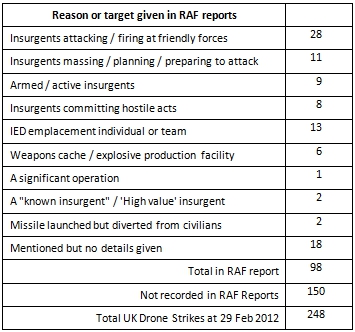 We know from a Freedom of Information (FoI) request that there have been 248 British drone strikes to date (29 Feb 2012). This means that the strikes recorded in the weekly Operational Updates represent only 40% of the total number of British drone strikes. Details of the other 60% remain secret and unreported. In addition the reports have obviously been self-selected by the RAF and none of the reports have been independently verified. Tellingly a British strike that took place on 25th March 2011 in which at least four civilians were killed was not mentioned in the weekly reports and all reports of Reaper activity ceased for eight weeks after.